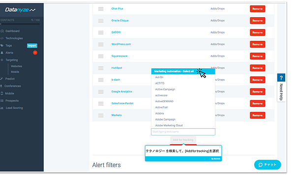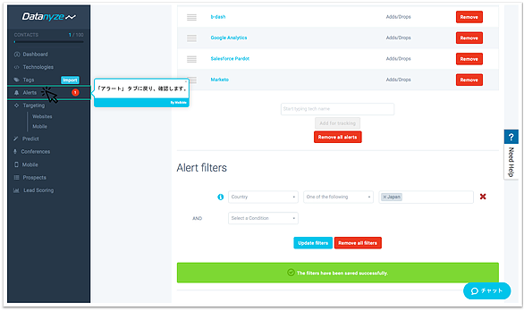 検索を絞り込みたい場合、フィルタを追加し、[Update filters]を選択(任意)。例えば「Alert Filter」で条件(対象国を「日本」等)を選択するだけで、日本で採用しているテクノロジーをトラックできます。
